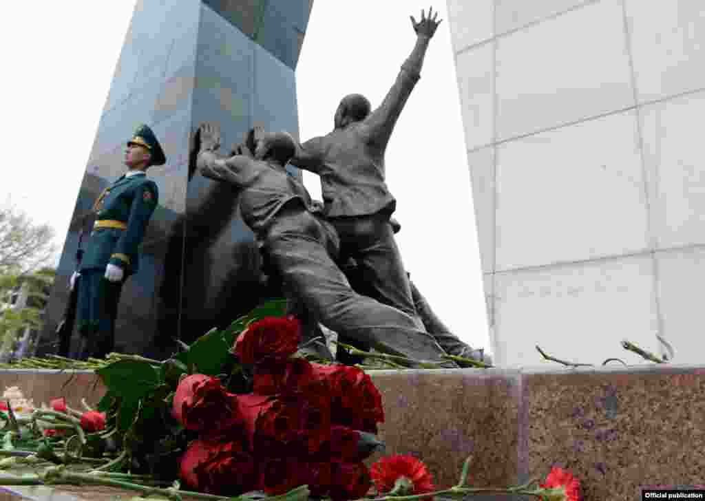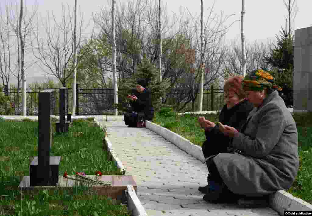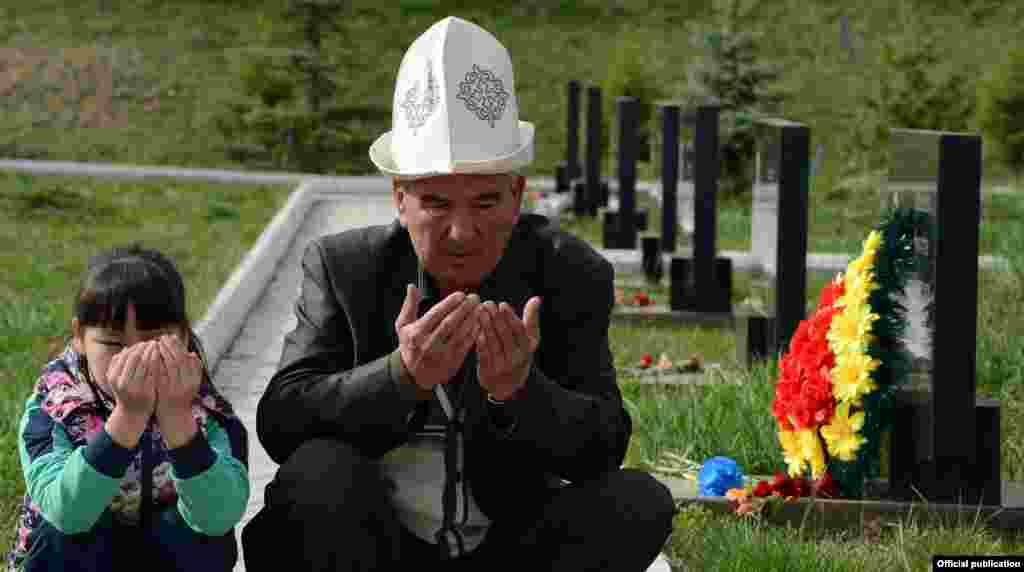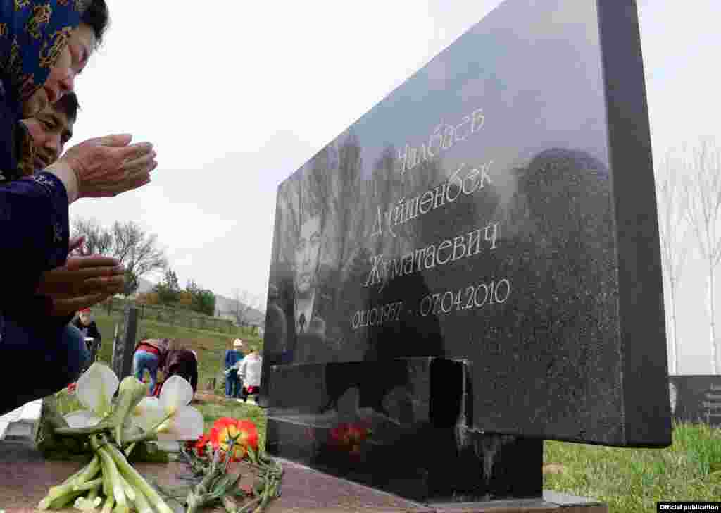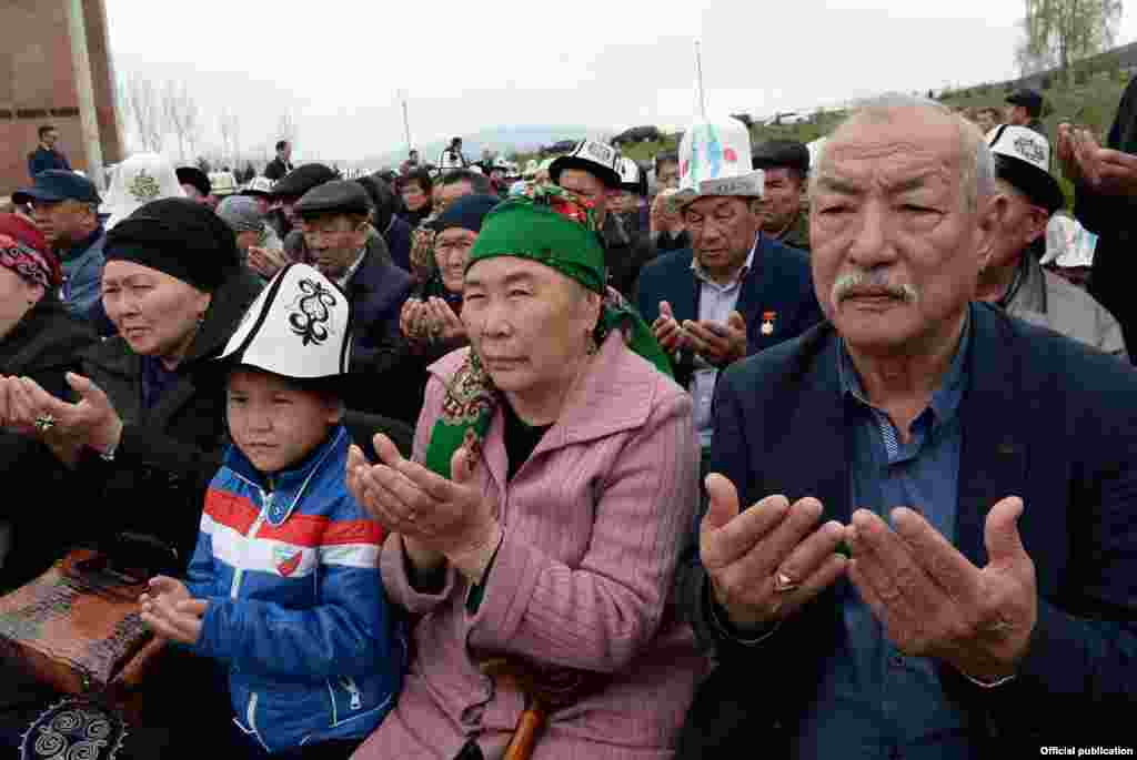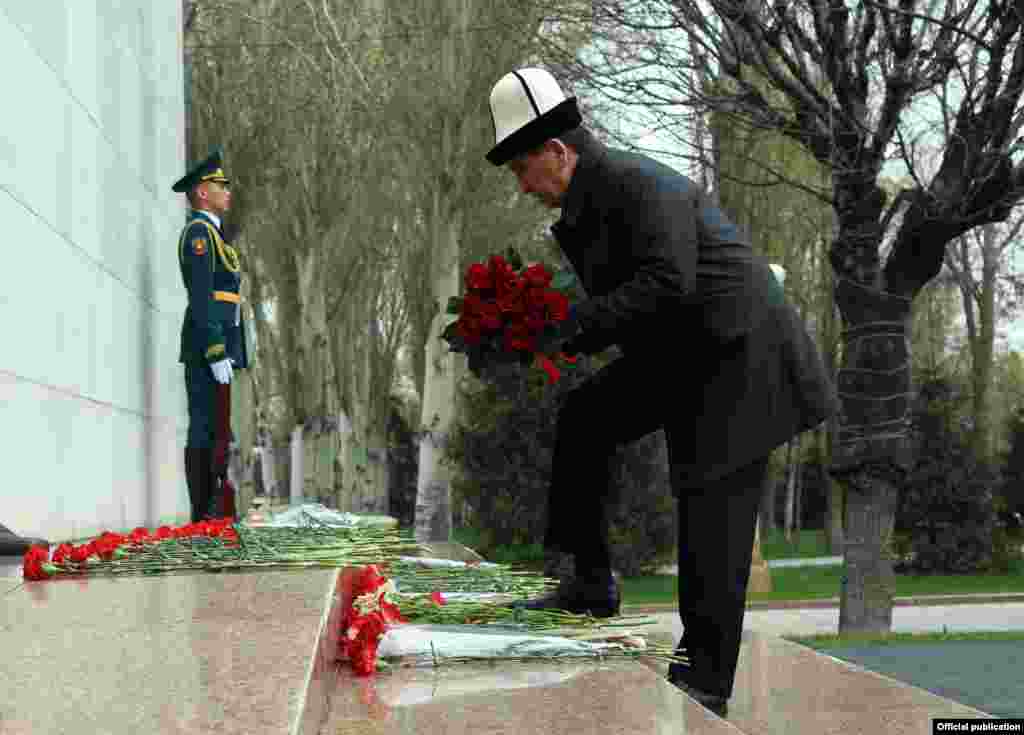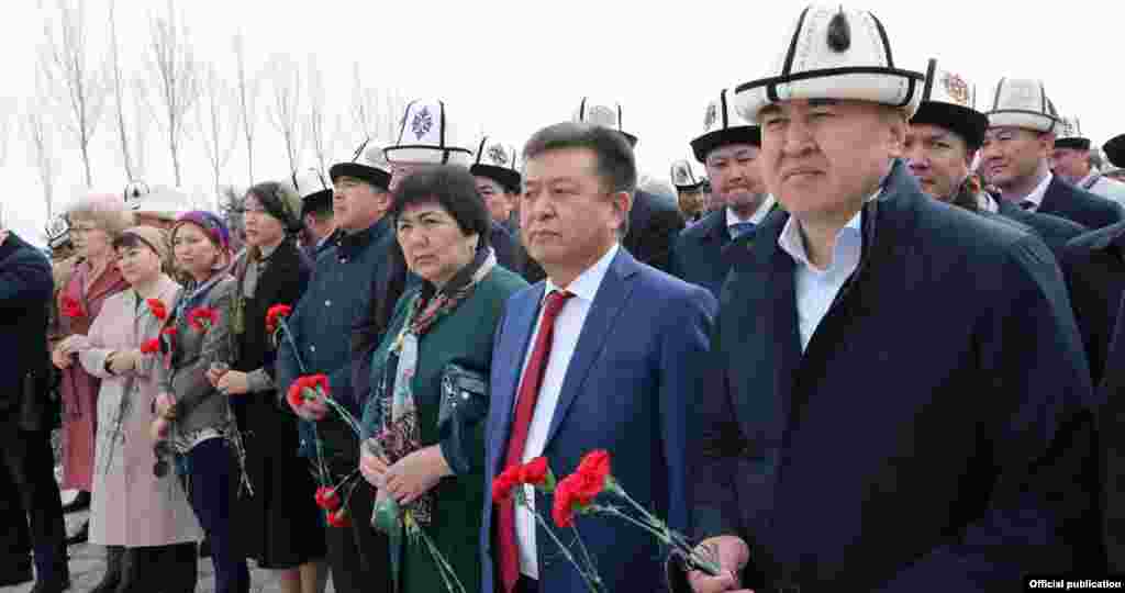 В мемориальном комплексе «Ата Бейит» состоялось поминальное мероприятие и церемония возложения цветов к мемориальной стене памяти погибших в апрельских событиях 2010 года. Здесь похоронены погибшие во время апрельских событий кыргызстанцы, они боролись с семейно-клановым режимом Курманбека Бакиева. Фото пресс-службы президента и парламента.