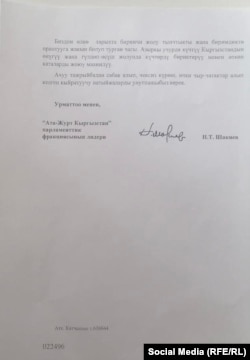 Публикация вышла под названием «Похожая подпись. Шакиев обращался к генпрокурору с просьбой реабилитировать Бакиева?». В письме указано, что оно отправлено 28 апреля 2022 года за номером №6-6651/22. На тот момент Нурланбек Шакиев был не спикером Жоорку Кенеша, а лидером фракции «Ата-Журт Кыргызстан».