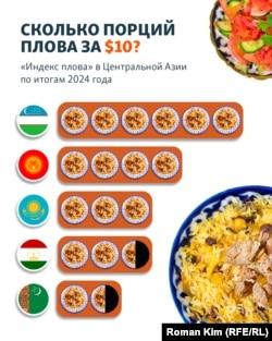 В Узбекистане с 2020 года составляют «Индекс плова» или Pilav Indexi, который служит наглядным показателем инфляции. Его ввели по аналогии с другими известными продуктовыми рейтингами вроде индекса Биг Мака, оливье, борща, пиццы и даже хачапури. Госкомстат Узбекистана для расчета этого показателя использует среднюю стоимость порции или килограмма блюда, которое является объектом нематериального культурного наследия ЮНЕСКО. Как мог бы выглядеть Pilav Indexi, если его подсчитывали бы и в других странах Центральной Азии, и в какой из республик региона плов-тур получился бы наиболее выгодным?
