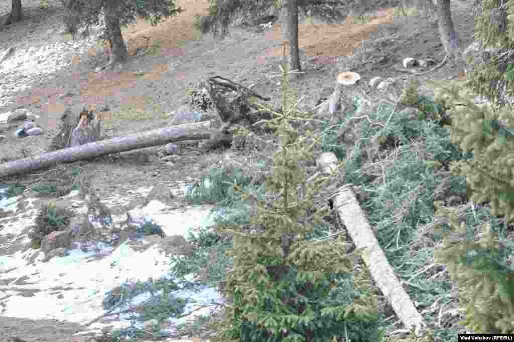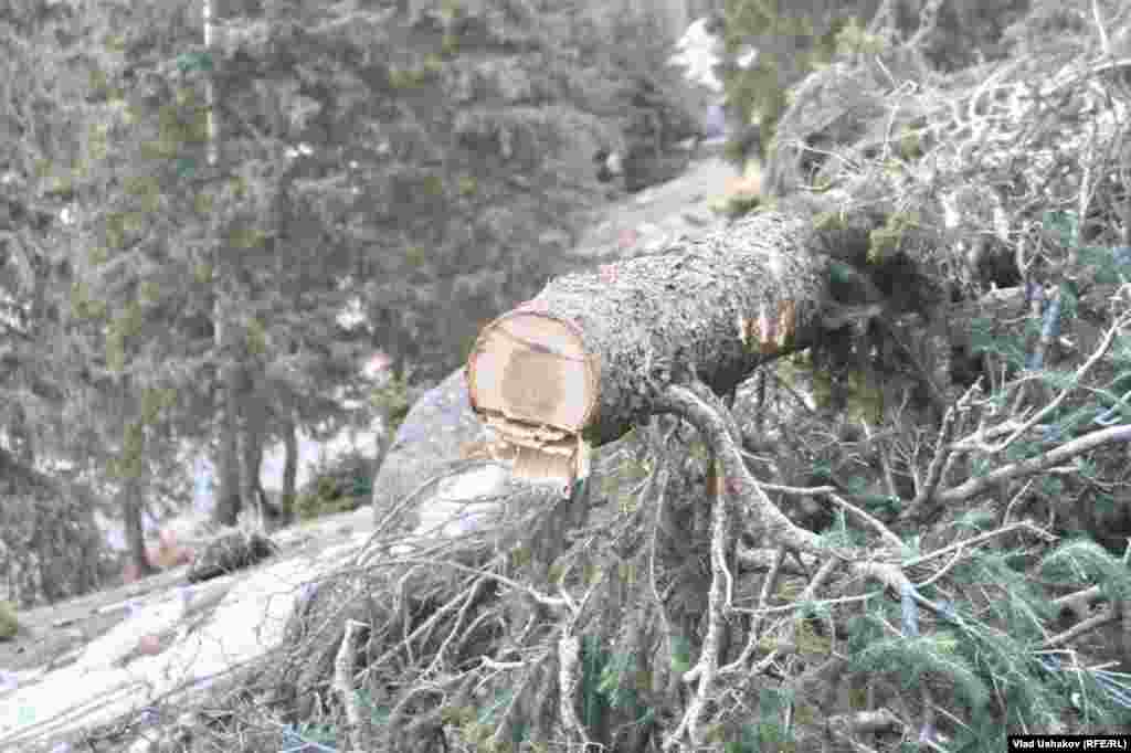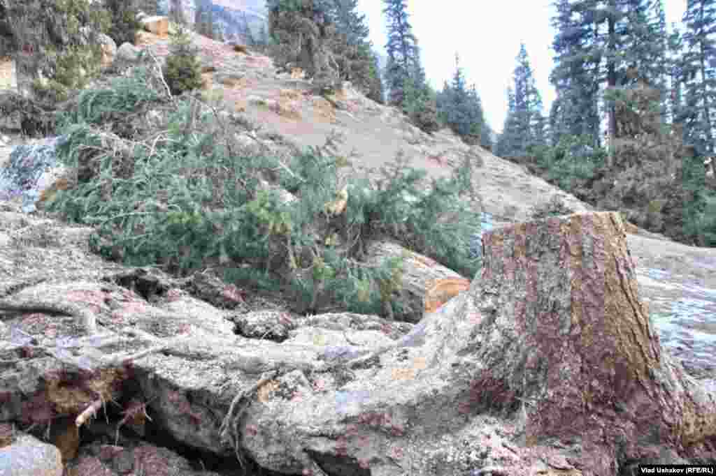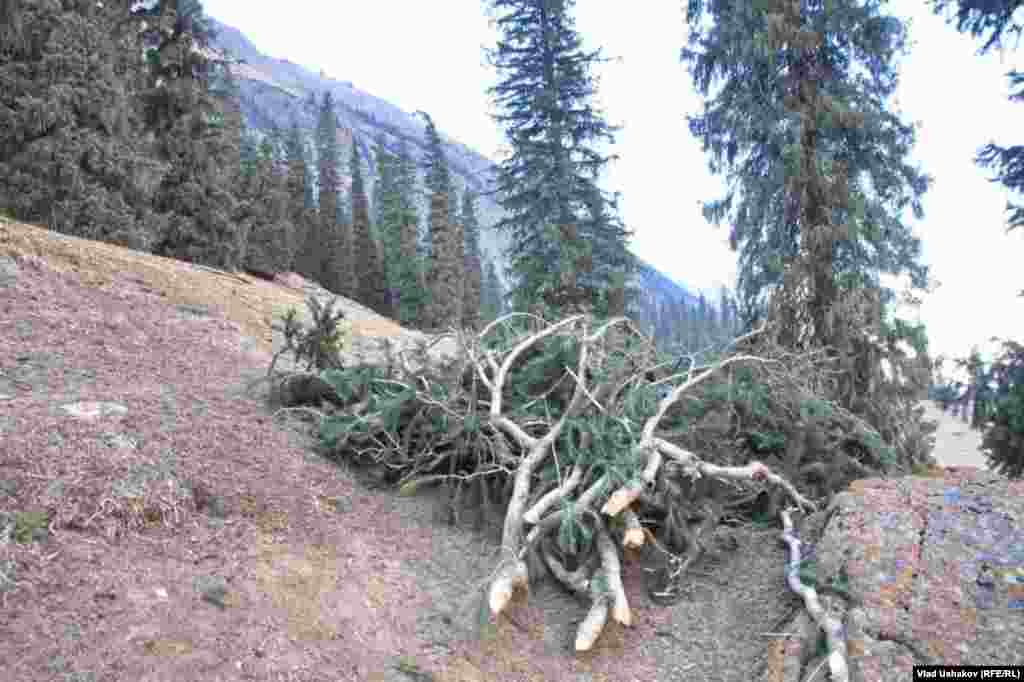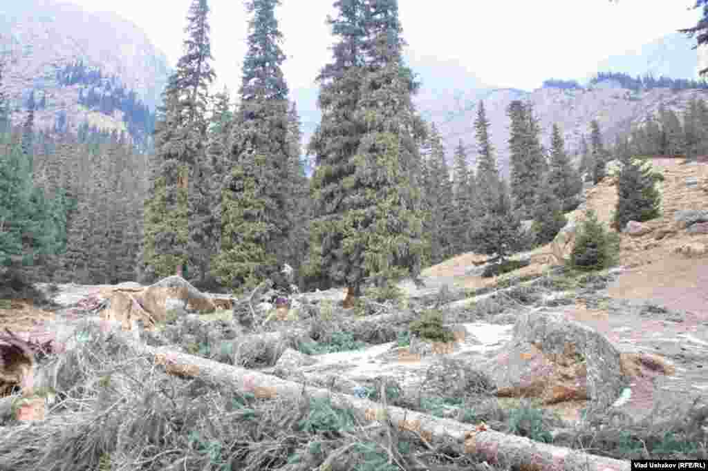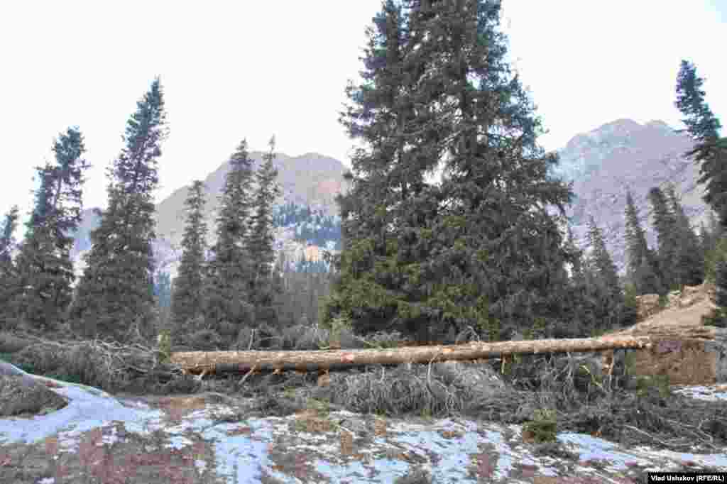 Леса занимают всего 4.32 процентов территории Кыргызстана и, располагаясь на горных склонах Тянь-Шаня и Памиро-Алая, играют большую водо-охранную и водорегулирующую роль. Леса являются «легкими» земли. Но вместо того, чтобы сохранить все это биоразнообразие, сегодня идет массовая вырубка лесов. На фотографиях Влада Ушакова запечатлена такая вырубка в ущелье Барскоон. Фотографии сделаны 3 февраля 2013 года. Кыргызская служба РСЕ\РС
