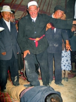 «Это вам не ресторан, пьющим водку не заходить!», - сказал бакшы-шаман Абдыкадыр. Когда люди затихли, он повел вокруг аркана больных: двух девушек и двух мушчин.